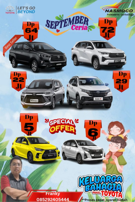 Saya FRANKY HERMANTO Sales Senior dan BEST SALES di Toyota Nasmoco Purwokerto. Siap Melayani Pembelian Mobil Toyota terbaru all type, seperti :